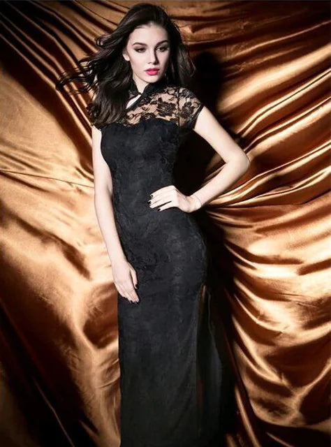 The dress features a chic stand collar and a stylish oblique lapel, providing a sophisticated touch that stands out in any setting. With three-quarter sleeves and a daring high slit, every movement you make will exude confidence and grace.